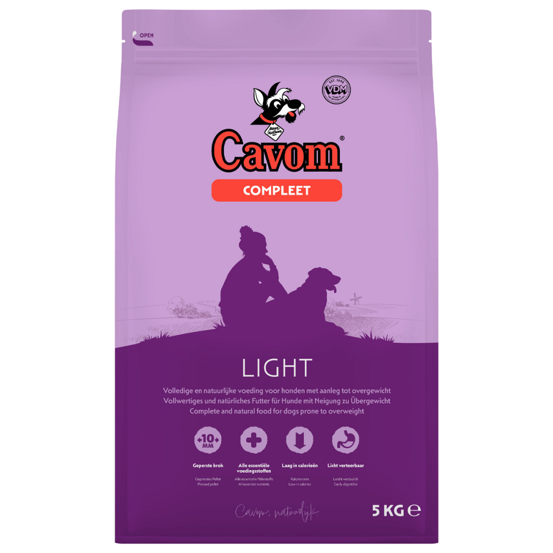 Cavom Compleet Light heeft een verlaagd vetgehalte en calorie-armere koolhydraten zonder dat de voedingswaarde verminderd wordt. Deze voeding bevat dierlijke eiwitten afkomstig uit rund en schapenvlees maar ook plantaardige eiwitten. Het rundvet en andere diverse olin gecombineerd met diverse aangepaste grondstoffen zorgen ervoor dat het voer optimaal is samengesteld voor honden die aanleg hebben tot overgewicht.