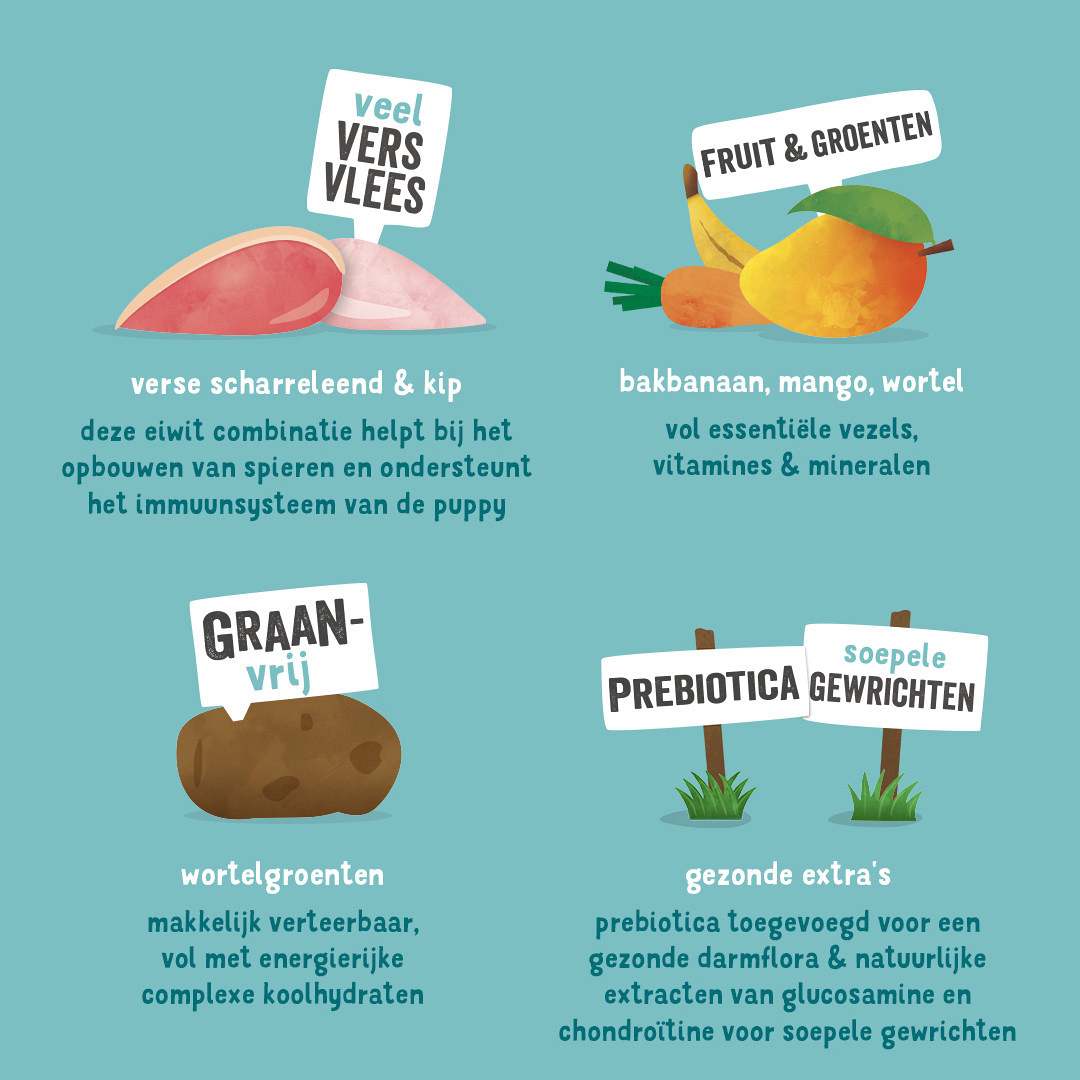 Graanvrij hondenvoer met vers scharreleend en scharrelkip voor puppy's.