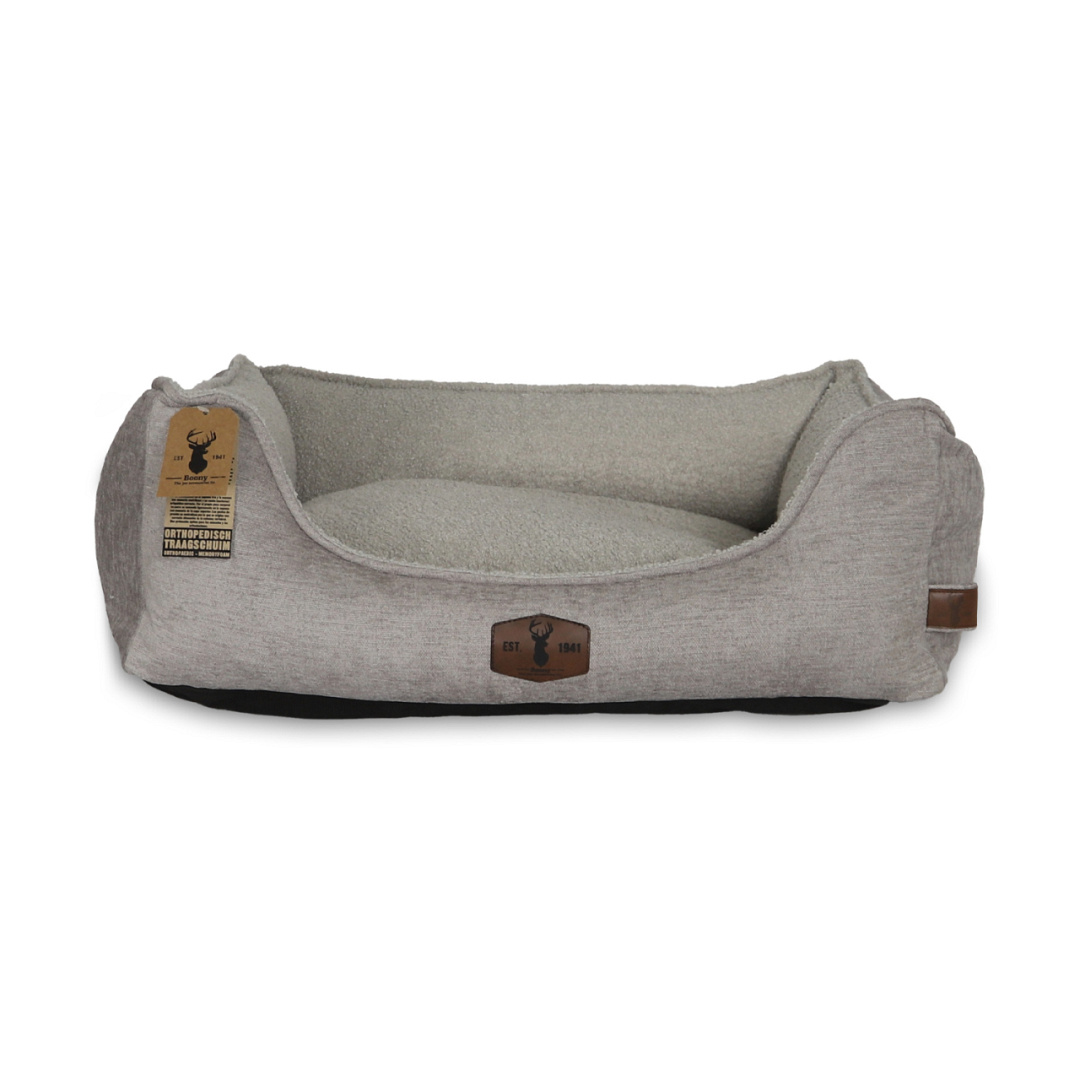 Deze Boony EST 1941 orthopedische hondenmand uit de premium range behoort tot de beste manden welke je voor jouw hond kunt aanschaffen. Deze mand biedt optimale ondersteuning aan de spieren en gewrichten van jouw hond. De stevige vulling van traagschuim draagt bij aan een orthopedisch verantwoorde (nacht)rust. Door zijn eigen lichaamsgewicht zakt je hond licht weg in het traagschuim. Drukpunten worden geneutraliseerd waardoor een orthopedisch correcte uitlijning van de wervelkolom ontstaat. Het kussen van deze mand is voorzien van 2 verschillende stoffen. Dit geeft je de mogelijkheid het kussen om te draaien waardoor het kussen direct een andere uitstraling krijgt. Hierdoor kun je zelf jouw favoriete uitstraling kiezen. De combinatie van de twee stoffen geven de divan een stijlvolle uitstraling die gemakkelijk in te passen is in allerlei interieurs.