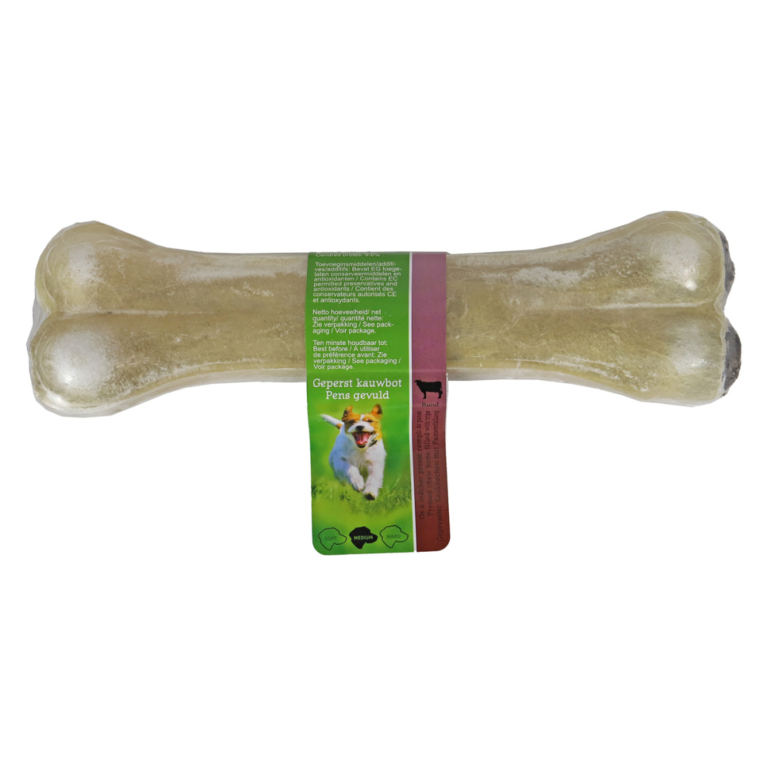 Dit geperste bot van buffelhuid gevuld met pens is 100% natuurlijk. De pensvulling maakt dit bot onweerstaanbaar lekker en de buffelhuid buitenkant zorgt voor extra lang kauwplezier.