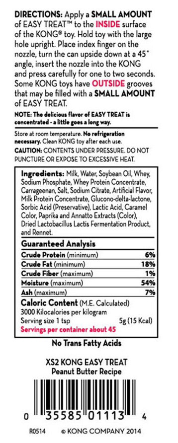De Kong Easy Treat peanutbutter spuitbus is gevuld met Kong's heerlijke pindakaaspasta voor je hond. Alle Easy Treats zijn gemakkelijk verteerbaar en bevatten geen transvetten. De unieke en handige spuitbus is milieuvriendelijk en heeft een ingebouwde spuitmond. Perfect voor het aanbrengen van kleine hoeveelheden Easy Treat-pasta in alle rubberen Kongspeeltjes.