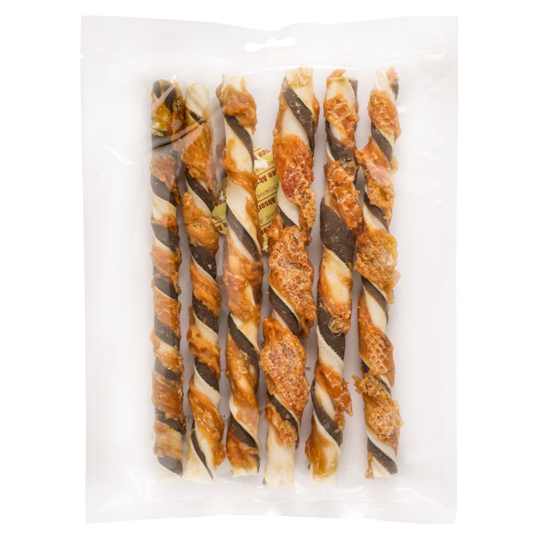 Smakelijke en natuurlijke hondensnack van runder- en varkenshuid omwikkeld met kip. Glutenvrij.