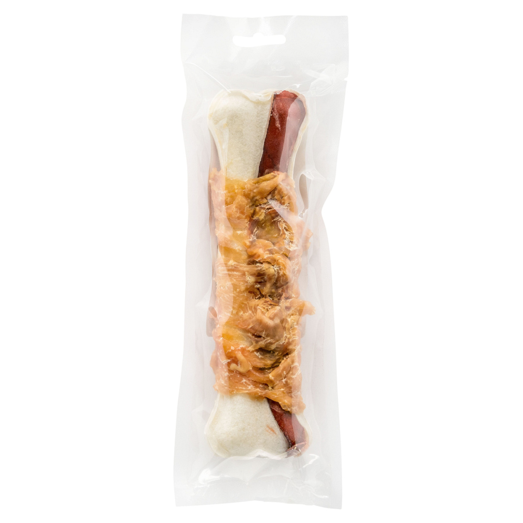 Combinatie van een stevige kern van gedroogde runderhuid, omwikkeld met zachte kipfilet.