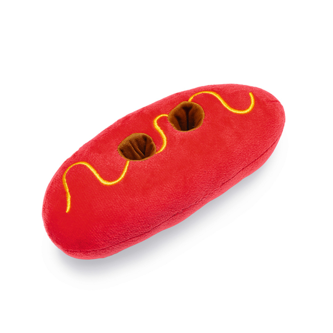 Grappig pluchen 2-in1 hondenspeeltje. Zonder piep.