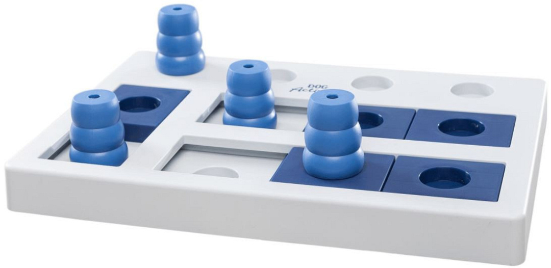 Bordspel voor gevorderde honden: door om de beurt bewegen van kegel en schuif komt de hond bij zijn beloning.