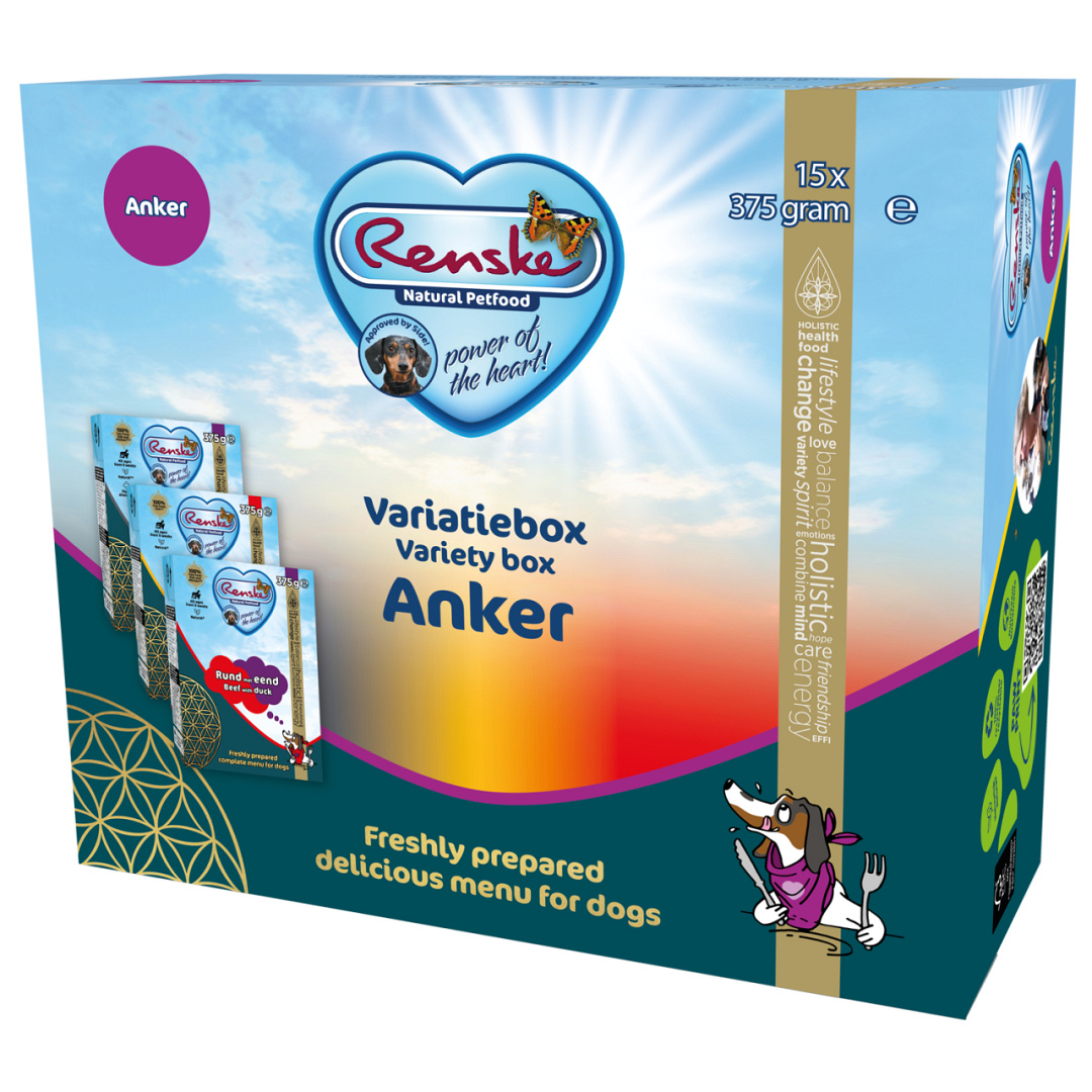 De Renske variatiebox Anker is een handige variatieverpakking met drie heerlijke varianten Renske Vers Bereid 375g! Met deze box kun je gemakkelijk variëren en combineren. De box bevat 5x konijn met eend (graanvrij), 5x kip met rund en 5x rund met eend.