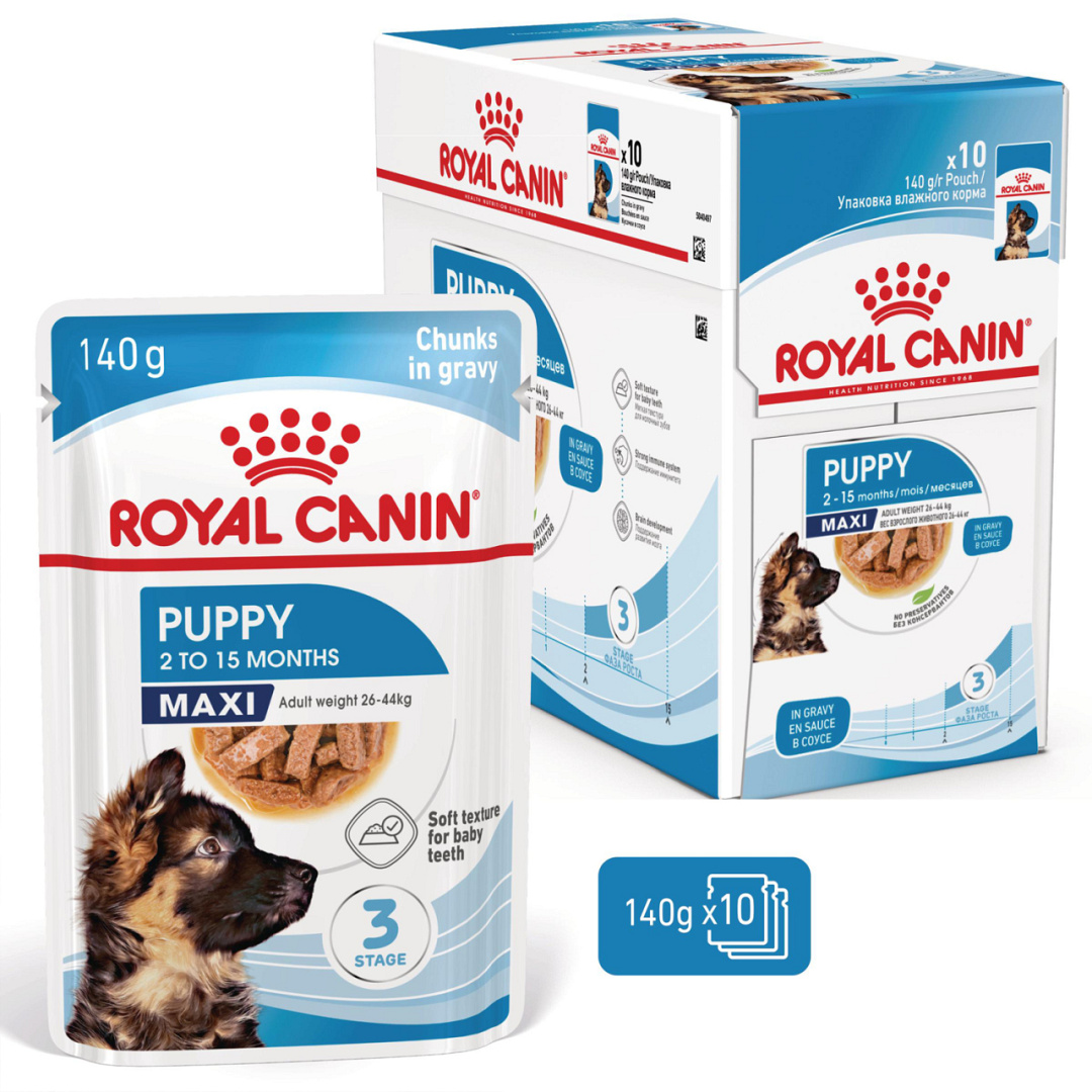 Royal Canin Maxi Puppy Wet hondenvoer is een volledige natvoeding voor pups, tot 15 maanden oud, van grote hondenrassen met een volwassen gewicht van 26 tot 45 kg.