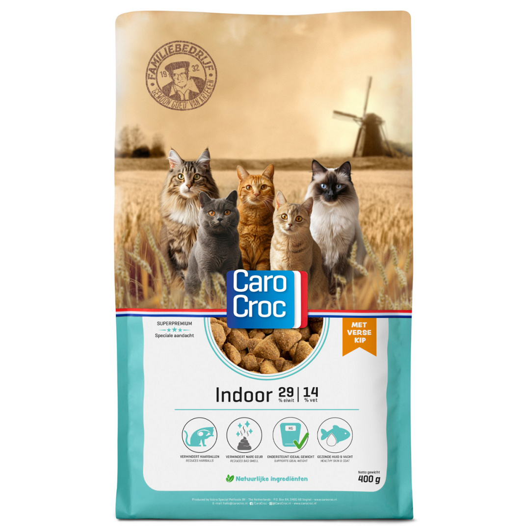 Het bevat een verlaagd energiegehalte en de toevoeging van natuurlijke vezels in CaroCroc Indoor helpt de vorming van haarballen te verminderen. Het toegevoegde zalmolie ondersteunt de huid- en vachtconditie. Daarnaast bevat CaroCroc Indoor extracten van de yucca plant die bijdragen om de geur van de ontlasting te verminderen.