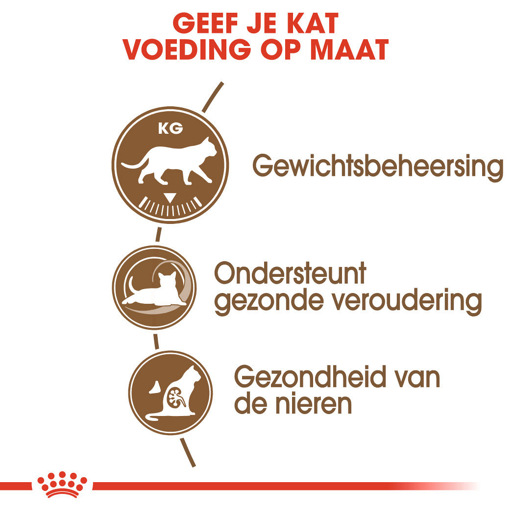 Deze voeding ondersteunt de ouder wordende kat. Vanaf 12 jaar beginnen de ouderdomsverschijnselen bij katten de overhand te nemen en worden deze steeds meer zichtbaar. Deze ouderdomsverschijnselen zijn onder andere: weinig eetlust, desoriëntatie, mogelijke slaap- en/of gedragsproblemen, stijfheid, pijn bij bewegen en gewichtsverlies.
