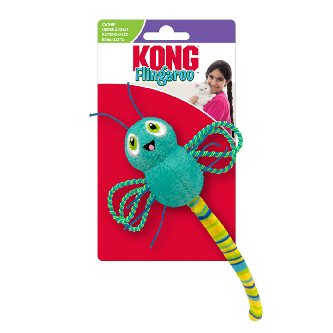 Laat je kat genieten van spannende jachtavonturen met het kattenspeeltje Flingaroo Dragonfly van Kong. De elastische vleugels zorgen voor lange afstandsvluchten, perfect voor uren vol spring- en vangplezier! Het lichte, kreukelende lichaam prikkelt de natuurlijke jachtinstincten, terwijl de speelse voelsprieten en poten onweerstaanbaar zijn om mee te slaan en te slepen. Extra bonus? De Kong Premium North American Catnip binnenin houdt het spel nóg langer spannend. Geef je kat een speelse workout vol actie en plezier!