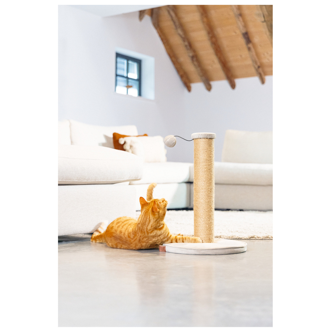 Designed by Lotte Krabpaal Yenna, zal prachtig staan binnen ieder interieur. Deze krabpaal beschikt namelijk over een voet die voorzien is van zacht fluweel. De krabstam is omwikkeld met juten touw. Jouw kat zal er erg graag zijn of haar nagels in willen zetten. Een krabpaal staat niet alleen mooi in huis, maar het is ook nodig om deze aan jouw kat aan te bieden. Een krabpaal zorgt er namelijk voor dat jouw kat, zijn of haar nagels kan verzorgen. Iets wat ze van nature graag doen. Bovendien kan een krabpaal voorkomen dat jouw kat zijn of haar nagels gaat slijpen aan meubels of tapijt. Het spelen met deze Designed by Lotte Krabpaal Yenna wordt nog leuker door toevoeging van het kattenspeeltje in de vorm van een fluwelen bolletje, die aan de krabpaal bevestigd is.