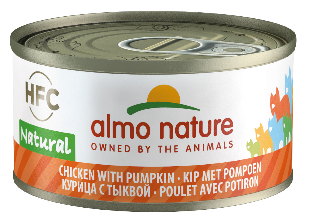 Almo Nature kattenvoer HFC Natural kip en pompoen is een aanvullend natvoer voor volwassen katten en heeft een onweerstaanbare smaak door het hoge percentage aan vlees. Alle natvoer recepten zijn bereid met natuurlijke, verse kip die van oorsprong geschikt is voor menselijke consumptie. Hierbij wordt dezelfde kwaliteit ingrediënten gebruikt als die zijn toegevoegd aan voeding voor mensen. De conservering vindt plaats in de eigen kookbouillon, dit zorgt ervoor dat voedingsstoffen en smaak behouden blijven.