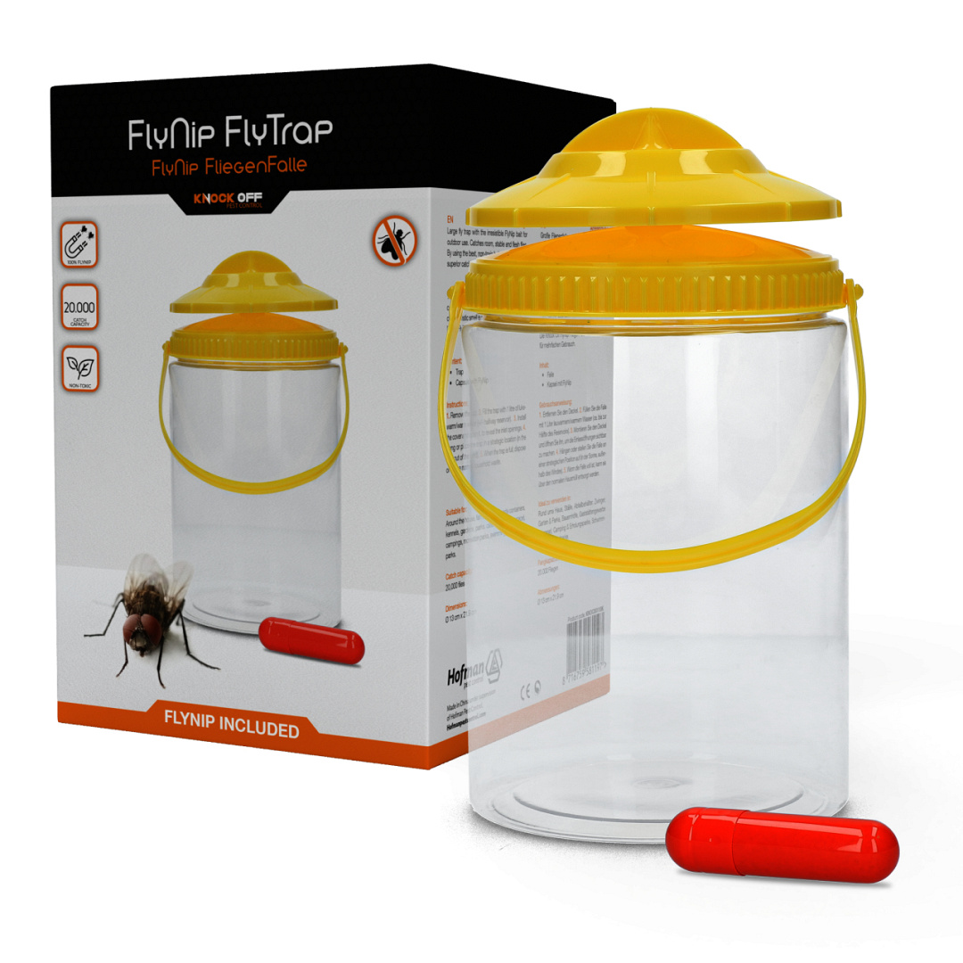 De FlyNip vliegenval is een groot uitgevoerde vliegenval met het onweerstaanbare lokmiddel FlyNip voor gebruik buitenshuis. Vangt kamer-, stal- en vleesvliegen. Door gebruik te maken van het allerbeste, gifvrije lokmiddel heeft deze vliegenval superieure vangstresultaten tot 20.000 vliegen.