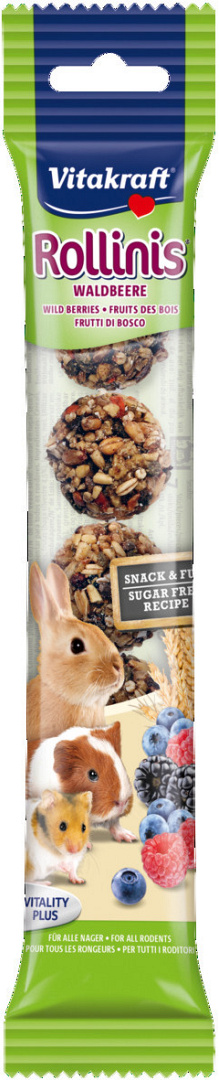 Vitakraft Rollinis bosbessen met granen zijn naast een verantwoorde snack een actief speeltje voor alle knaagdieren en konijnen.