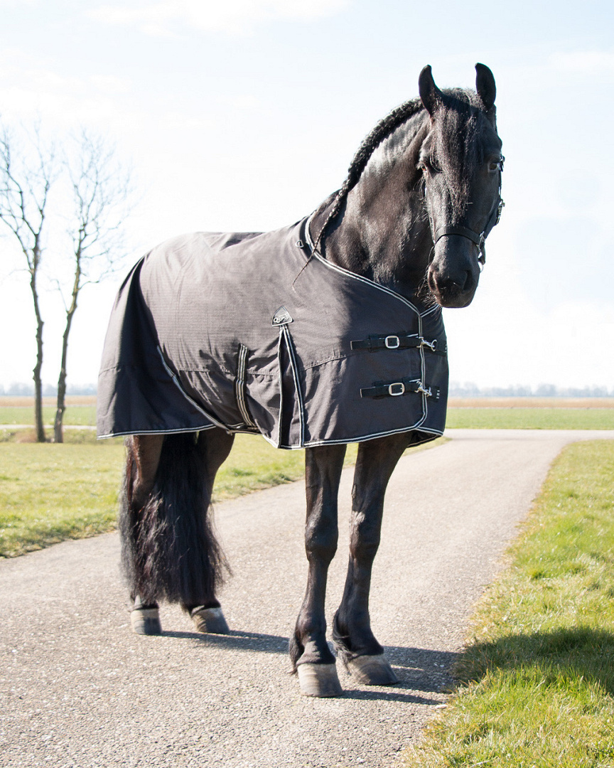 Waterdichte en ademende deken met 300 grams vulling. Met een ruimere hals speciaal voor barokke paarden.