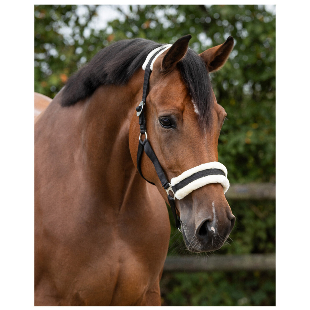 Degelijk halster met imitatiewol onder de neusriem en het kopstuk. Op het kopstuk aan twee kanten verstelbaar.