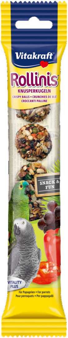 Vitakraft Rollinis papegaai met zaden, vruchten en groente zijn naast een verantwoorde snack een actief speeltje voor papegaaien.