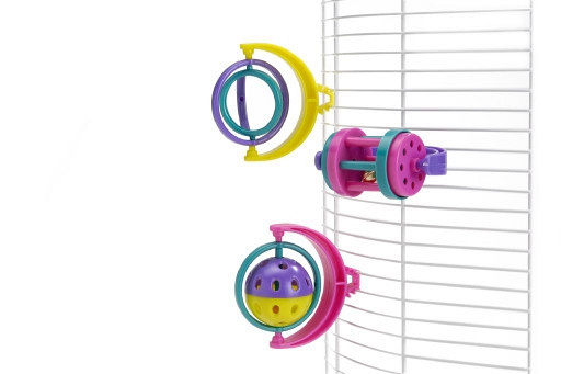 Vrolijk gekleurd speeltje dat aan de tralies van de kooi kan worden bevestigd. Variant niet vrij te kiezen.