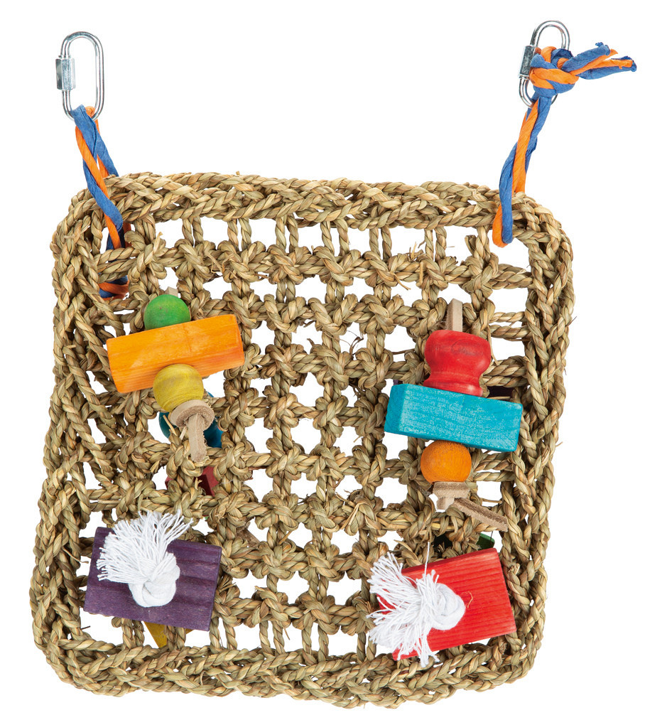 Vogelspeelgoed gemaakt van zeegras en hout. Bevat gekleurde blokjes en kralen, voor extra speelplezier.
